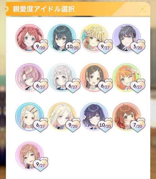 周回要素があるので親愛7の壁で止まっているアイドルも多いですが、そこは地道に条件を達成するしかないです…。