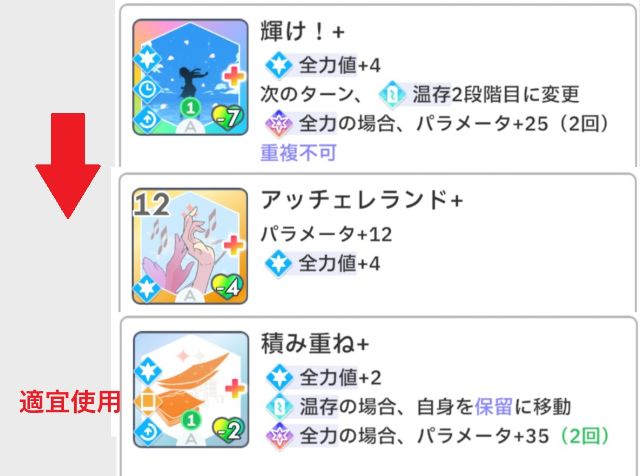 全力型はカスタムで[レッスン中1回]を削除した「輝け+」と「アッチェレランド+」を使用しつつ、温存から全力になったターン(スキルカード使用数追加+2のとき)や全力値の貯金ができているときにはカスタムで2回攻撃できるようにした「積み重ね+」で大きくスコアを稼ぐやり方ができます。