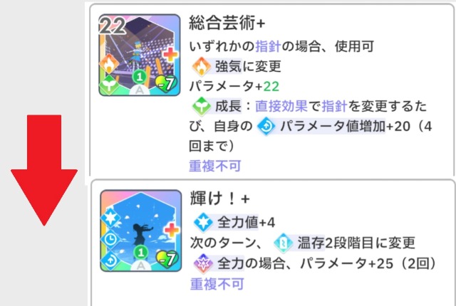 強気型はカスタムで[レッスン中1回]を削除した「輝け+」で温存にしつつ、「総合芸術+」と「輝け+」をループさせるだけです。