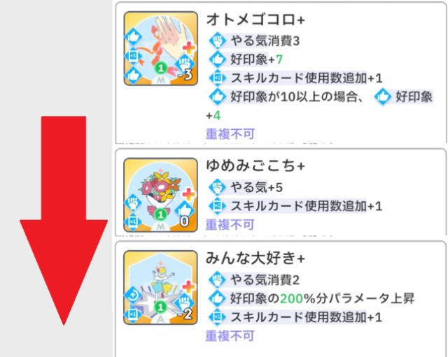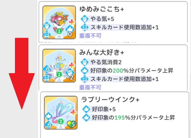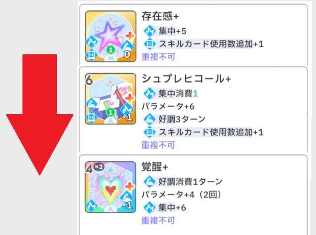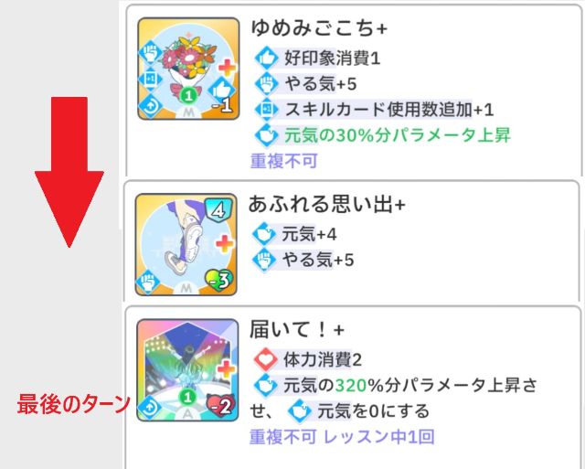 - プロデュース中に[レッスン中1回]のスキルカードのみを拾っていく