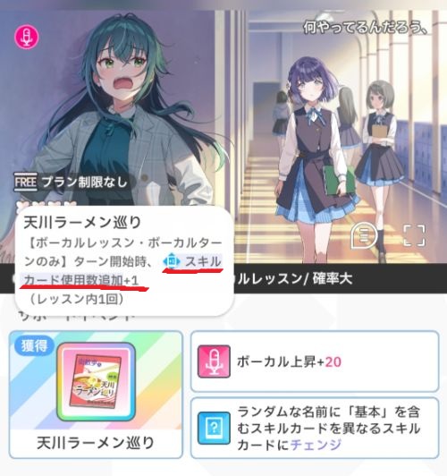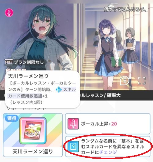 チェンジの場合はチェンジ先がランダムのため、[レッスン中1回]のスキルカードにチェンジされない可能性もあります