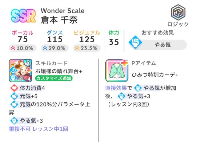【Wonder Scale】は固有スキルもPアイテムも使いやすいので序盤でも中盤でも使いやすいアイドルという印象です(学マスを始めてすぐ手に入ったSSRだったので補正がつよいかも)