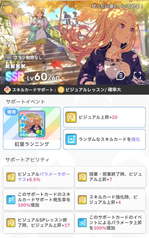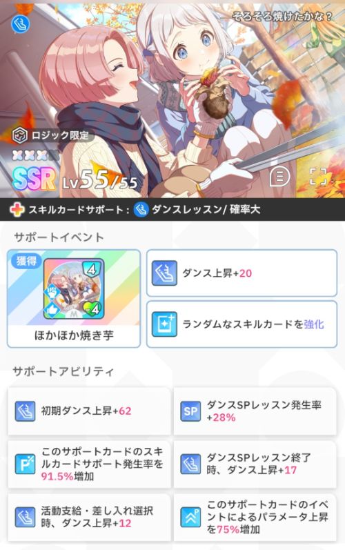 また、紅葉ランニング、お姉ちゃん参戦、焼き芋、夏夜のスキルカード獲得(どれもSSR)もパラメータアップが望めるのもウマみ…。