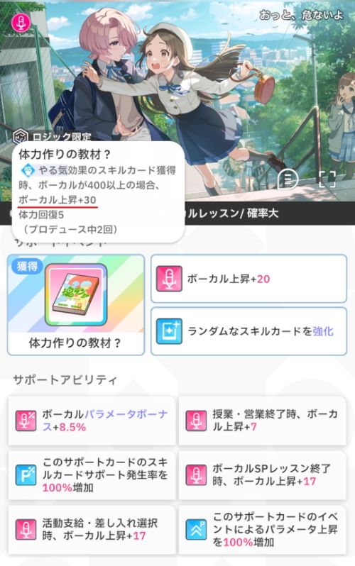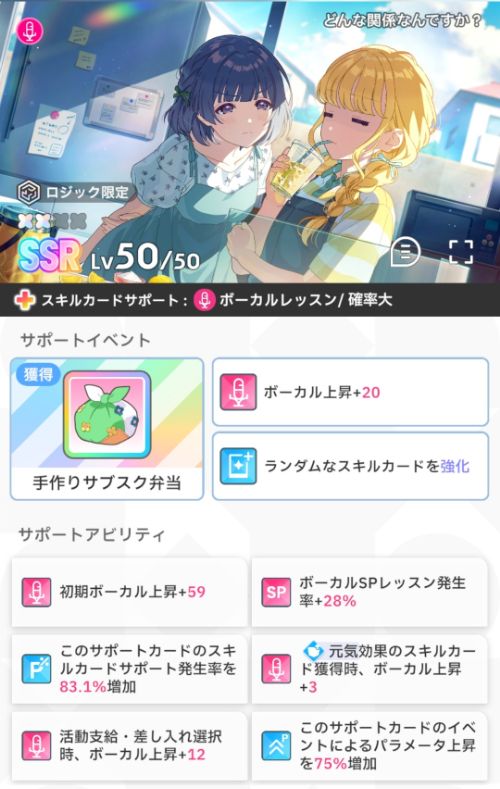 Vo.のサブスク弁当は「元気カード獲得」アビリティ(お姉ちゃん参戦と同効果)と「活動支給時」アビリティがあって他のカードともシナジーがあったので、Vo.レッスンは踏まないけど導入(その分Vo.SP発生率アビリティは完全に捨て)