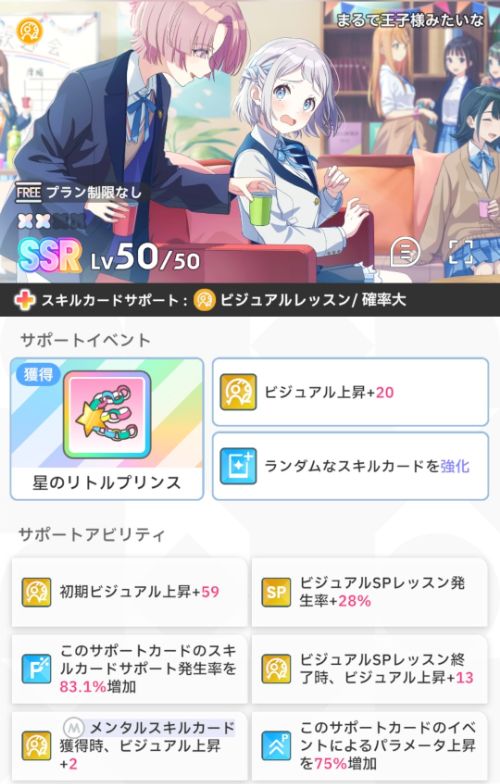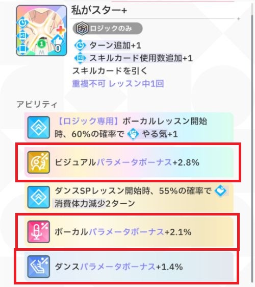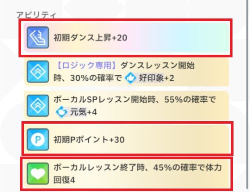 「〇〇レッスン終了時」(SPレッスンと記載がない)アビリティは「〇〇SPレッスン終了時」のものと比べてパラメータ上昇に10程度の差が出てしまうのでかなりしぶいです。