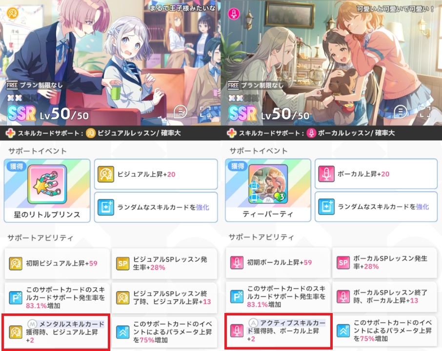 よくない例として、「アクティブスキルカード獲得時」と「メンタルスキルカード獲得時」のアビリティを同時に編成してしまうと、スキルカード獲得時にどちらかのアビリティは確実に発動しなくなるのでパラメータのロスが発生します。