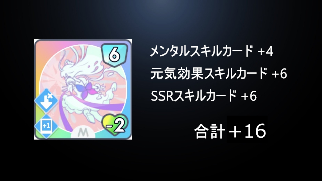 「アイドル魂」のようなメンタル・元気・SSRのカードを拾えば一気に+16されるので積極的に獲りにいってましたし、相談でも膨張覚悟で該当スキルカードをたくさん交換してました。