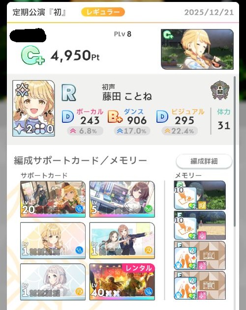 ロジックの場合、やる気型のアイドルで狙おうとするとレッスンで事故りまくってパラメータが上がらない…なんてことも多くなるので、C+を狙うくらいなら好印象型のほうが安定するかもしれません。