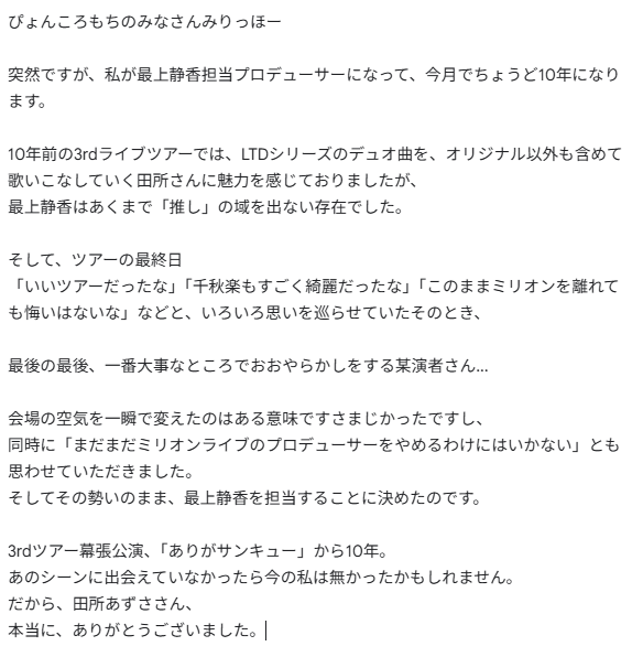 他の方も書いていた気がしますが、あれは単なる失敗談ではなくミリオンライブの方向性を大きく作り上げたエピソードということもあり、忘れることはできません。