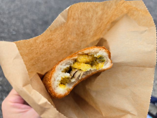 「静香のうどん粉生地で包んだもちもち和風カレーパン」 うどん粉だからかうどーなつのようなカリモチ感(実はうどーなつを食べたことがない)。豚バラの入った蕎麦屋のカレーのような出汁感も特徴的でした